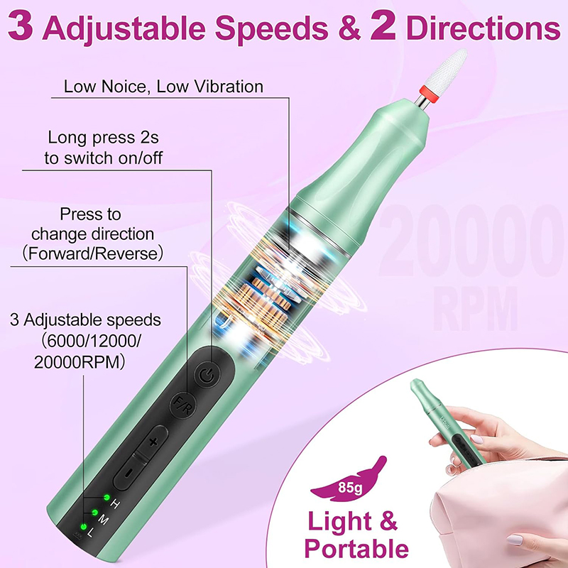 Professionelle Nagelfeilen sind mit 3 Geschwindigkeiten von 6000-12000-20000 ausgestattet. Drücken Sie einfach kurz die Taste + oder -, um die Geschwindigkeit zu erhöhen oder zu verringern. Passen Sie die Geschwindigkeit einfach an und sparen Sie Zeit beim Schärfen der Nägel. Die Bohrrichtung lässt sich einfach durch Drücken der Taste F/R ändern, ideal für Linkshänder, Nageldesign-Meister oder Anfänger in der Nagelpflege.