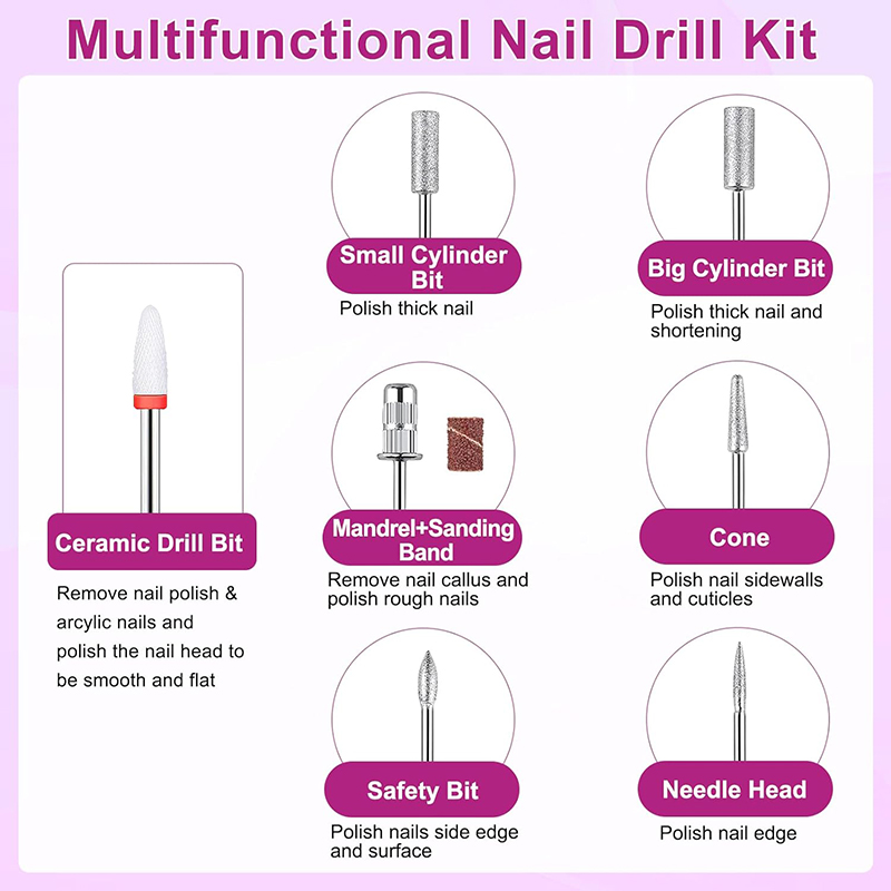 Die Nagelbohrmaschine umfasst 6 Nagelbohrer aus Edelstahl, 1 Keramikbohrer und 36 austauschbare Schleifstreifen. Das Maniküre-Pediküre-Set kann für Maniküre, Pediküre, Polieren, Formen, Nagelhautschleifen, Acryl-/Gelnägelentfernung oder zur Nagelpflege verwendet werden. Komplett mit Zubehör und einfach zu bedienen, perfekt für Nailart-Anfänger!
