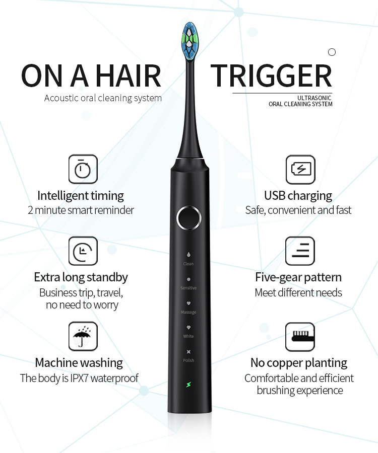- LEISTUNGSSTARKE SCHALLREINIGUNG – Neue verbesserte elektrische Zahnbürste mit neuester Schalltechnologie entlang des Zahnfleischsaums für außergewöhnliche Reinigung und Entfernung von bis zu 125 % Plaque, Aufhellung Ihrer Zähne und Verbesserung Ihrer Mundgesundheit in zwei Wochen, besser als mit einer Handzahnbürste. Wir versprechen: 1 Jahr Garantie, wenn Sie irgendwelche Probleme haben, kontaktieren Sie uns bitte, wir werden Ihnen einen zufriedenstellenden Kundendienst bieten.