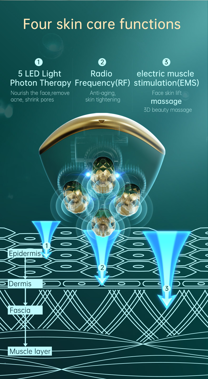 WAS SIND DIE VORTEILE? – Die Beauty Machine ist ein multifunktionales Anti-Aging-Gerät, das Radiofrequenztechnologie (RF) mit Rot-/Blaulichttherapie, EMS zur Reduzierung von Linien und Fältchen, Verbesserung der Hautpenetration und Absorptionsfähigkeit usw. umfasst.