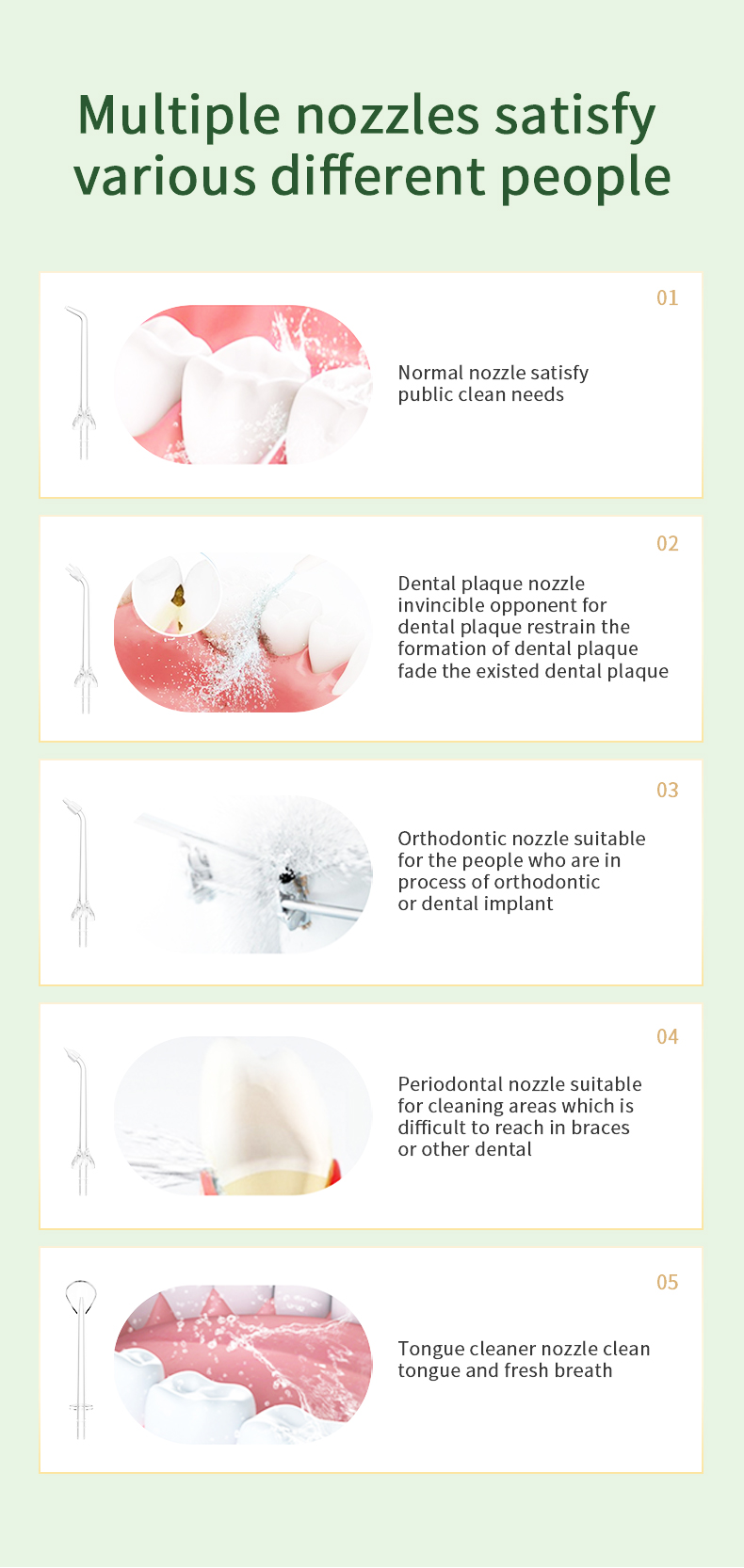 Unser Zahnseidegerät wurde von einem amerikanischen Dentalteam professionell bewertet und bietet fünf praktische Modi, die den unterschiedlichen Bedürfnissen von 99 % der verschiedenen Altersgruppen gerecht werden und gleichzeitig optimale Leistung und Lebensdauer gewährleisten. Sein ergonomischer Griff und 6 austauschbare Düsen sorgen für ein komfortables und vielseitiges Erlebnis. Es ist ein aufmerksames Geschenk für Geburtstage, Weihnachten, Thanksgiving, Valentinstag, Vatertag, Muttertag oder zur Pflege der Mundgesundheit Ihrer Lieben