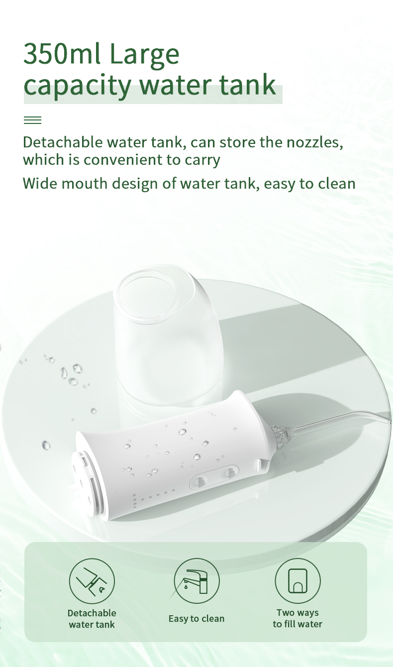 Diese Wasser-Zahnseide-Applikator verfügt über einen verbesserten 350-ml-Wassertank, der doppelt so groß ist wie bei anderen älteren Modellen. So ist ein häufiges Nachfüllen nicht mehr nötig und Ihre Mundreinigung wird bequemer und effizienter.